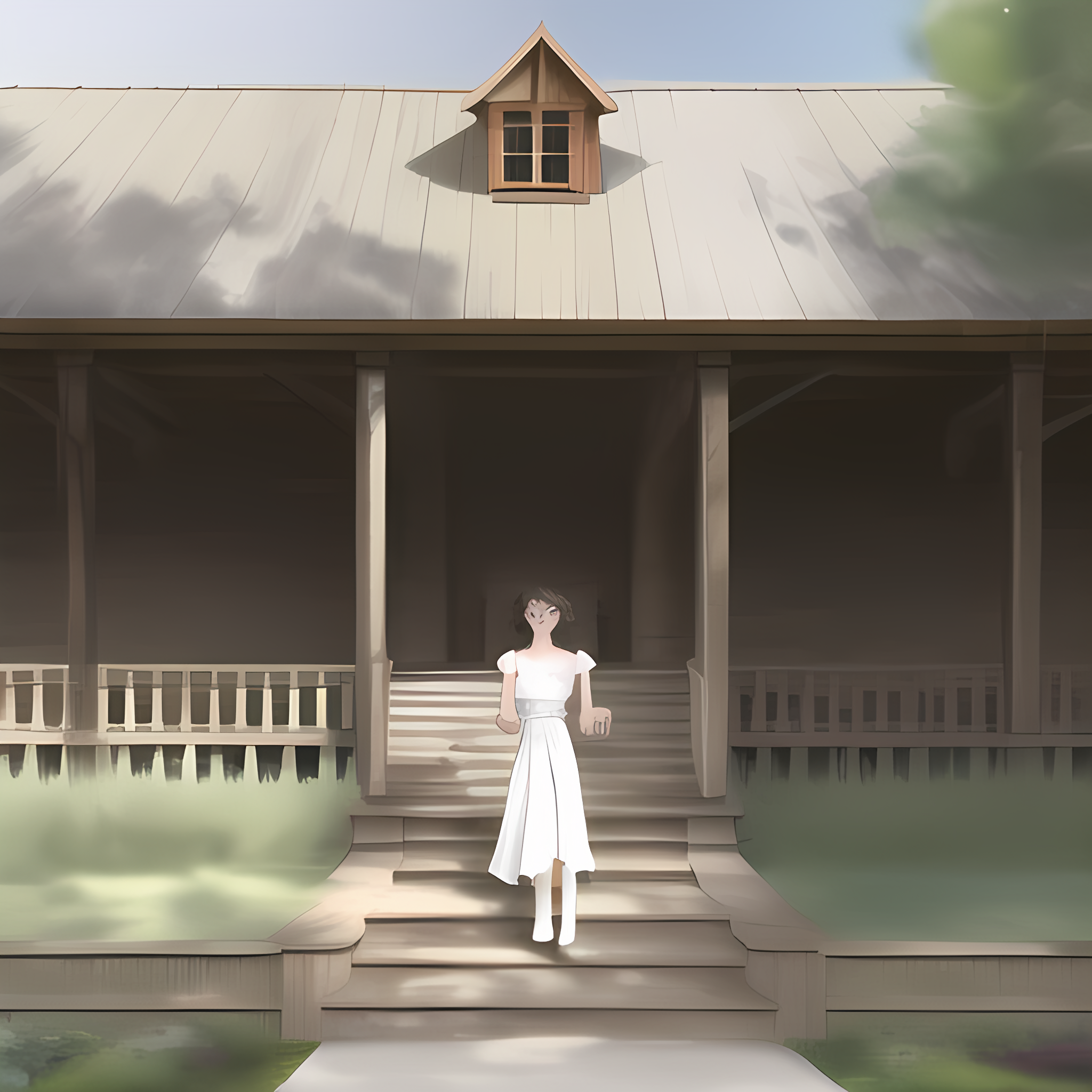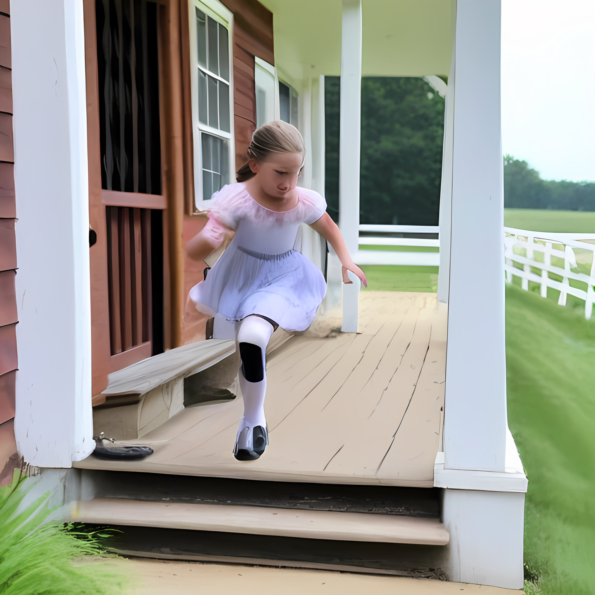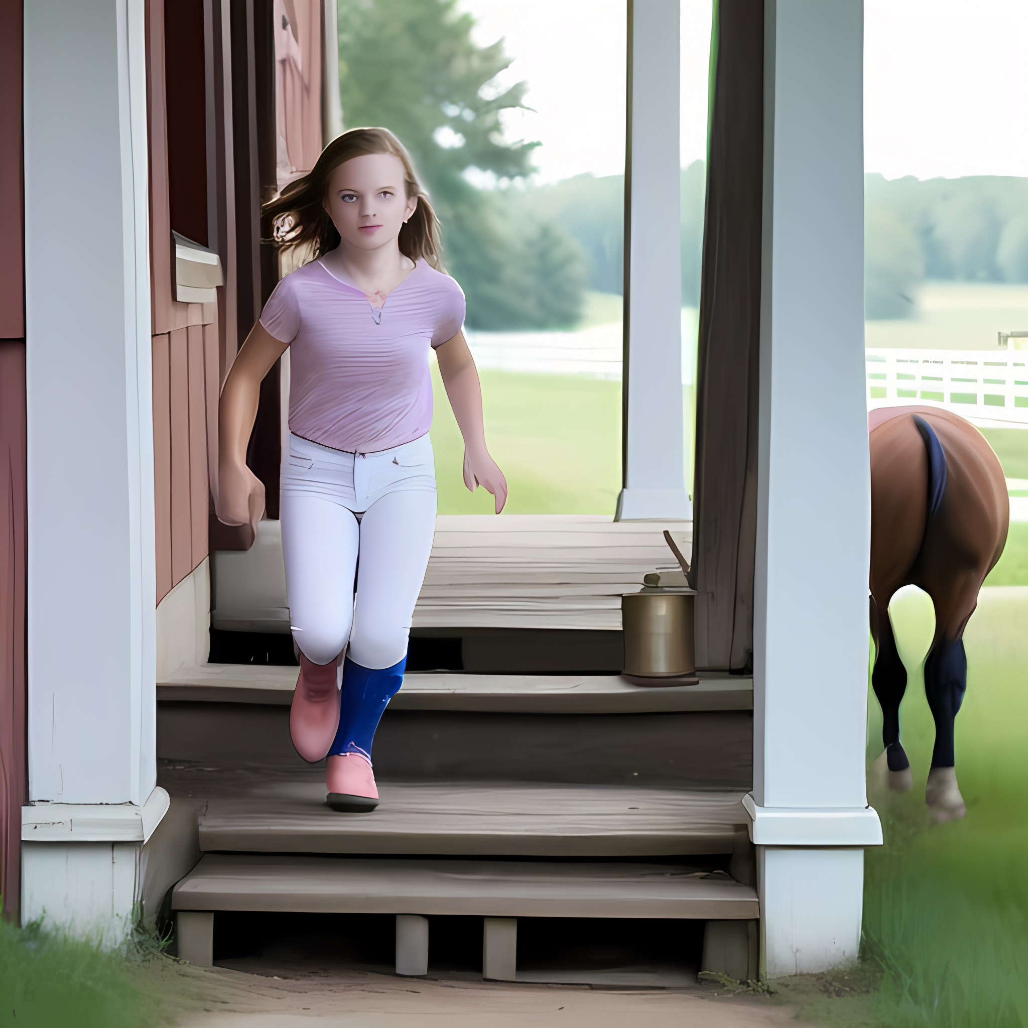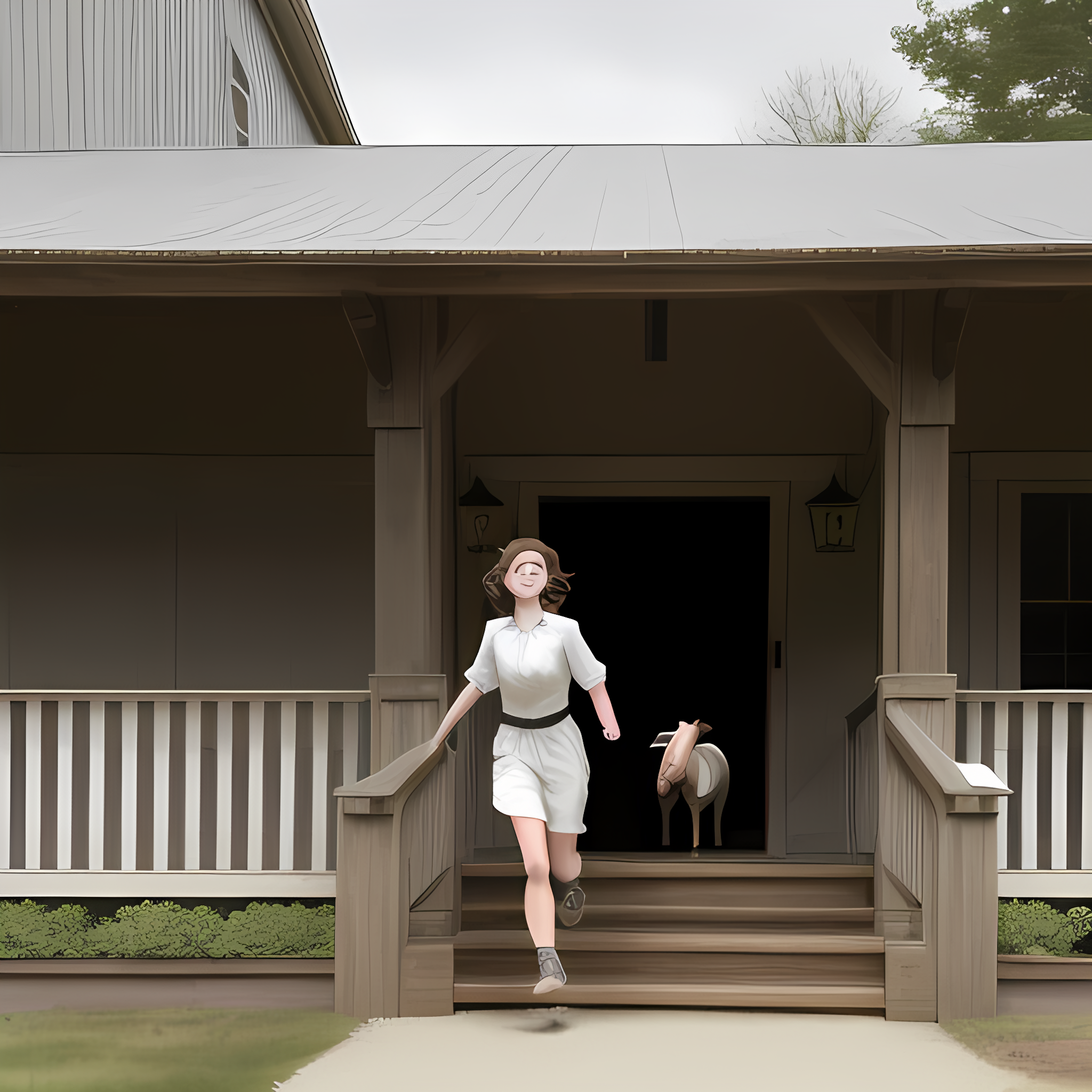 'MILLIE PARKER (6) races down the porch steps and turns toward the barn and stables.'